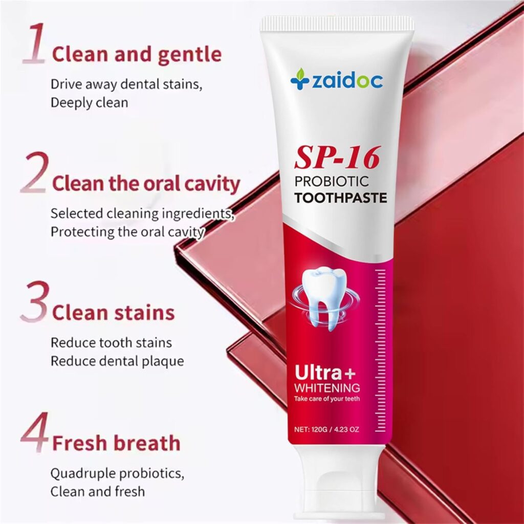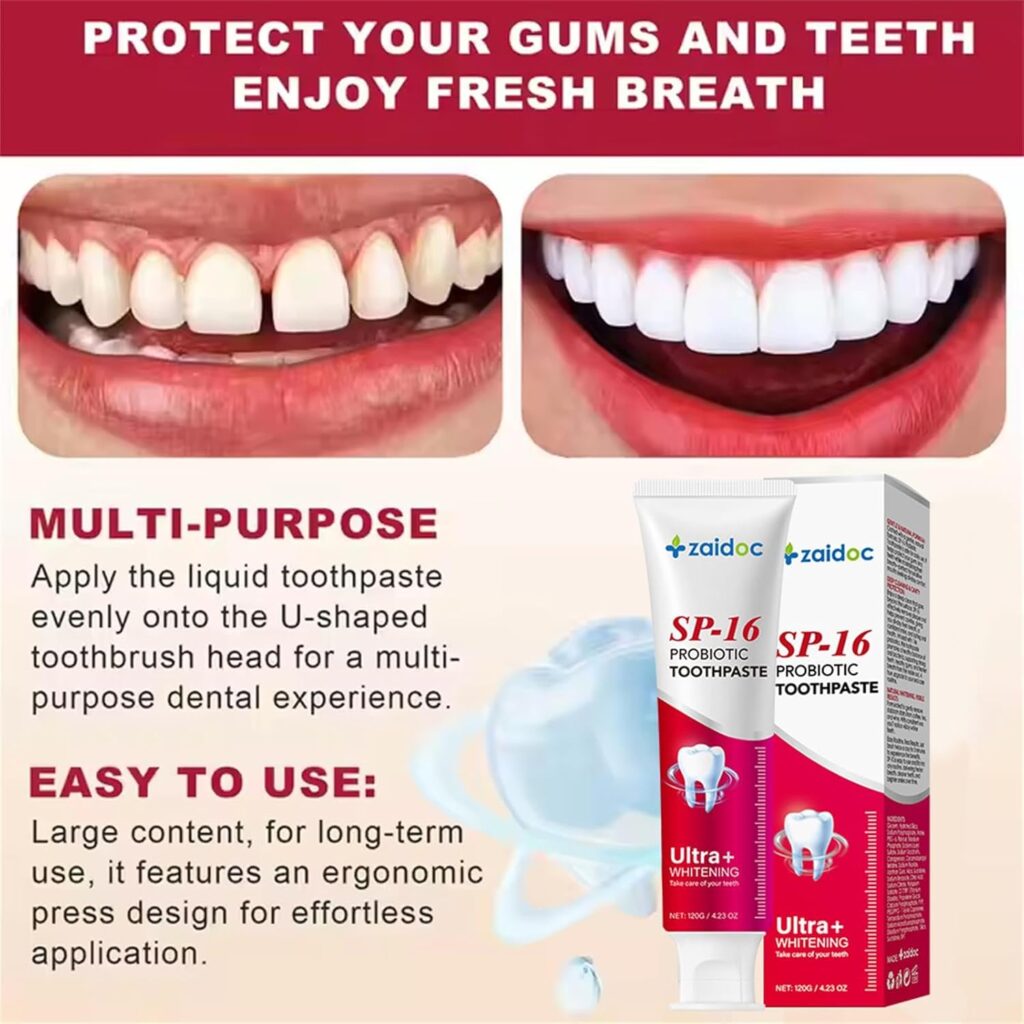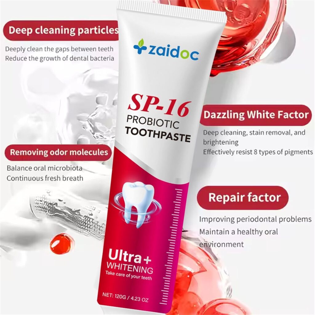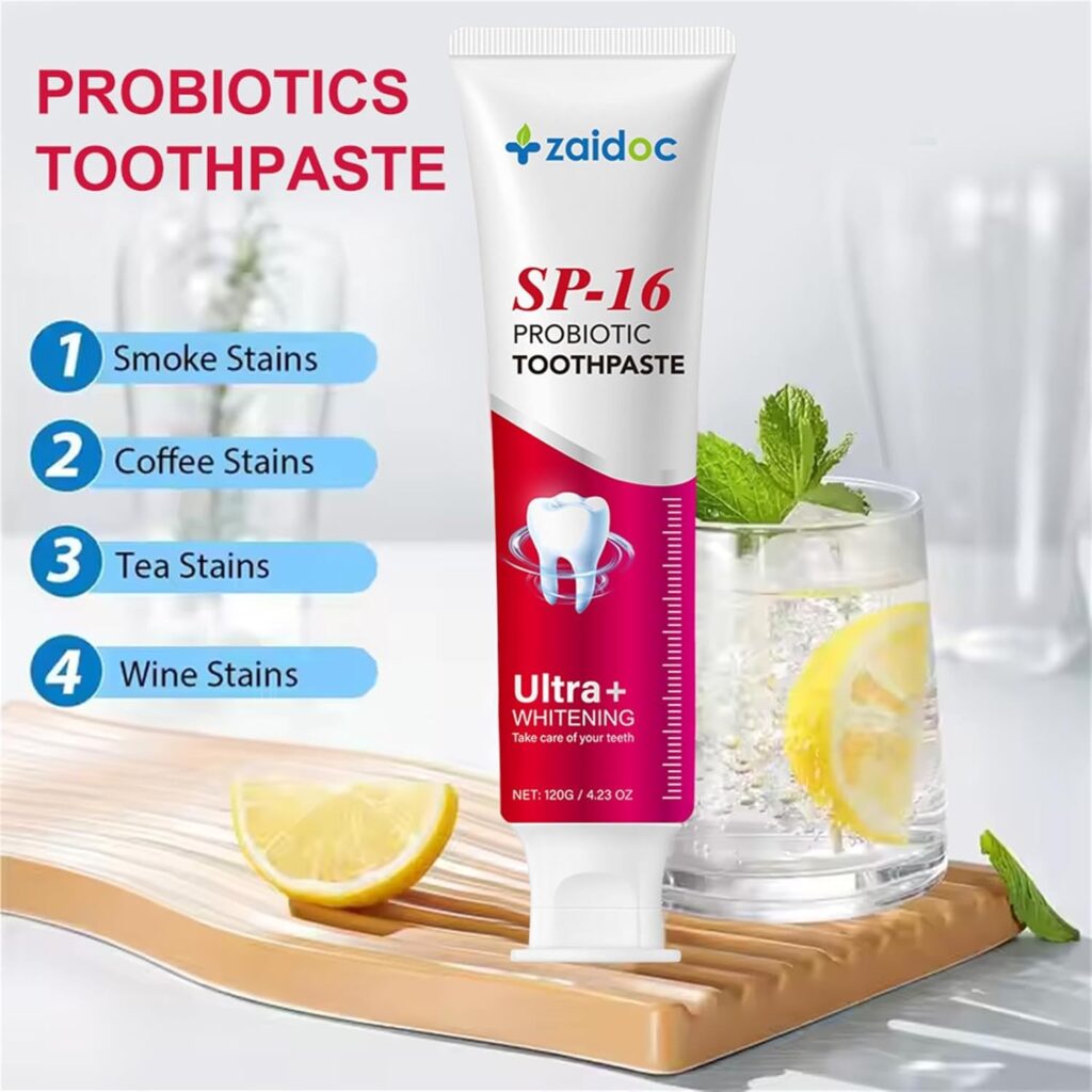 Probiotic-enriched whitening toothpaste designed for deep cleaning, stain removal, and sensitive teeth.